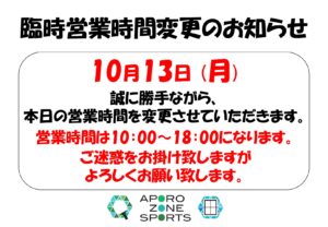 誠に勝手ながら10月13日の営業時間を変更させていただきます。